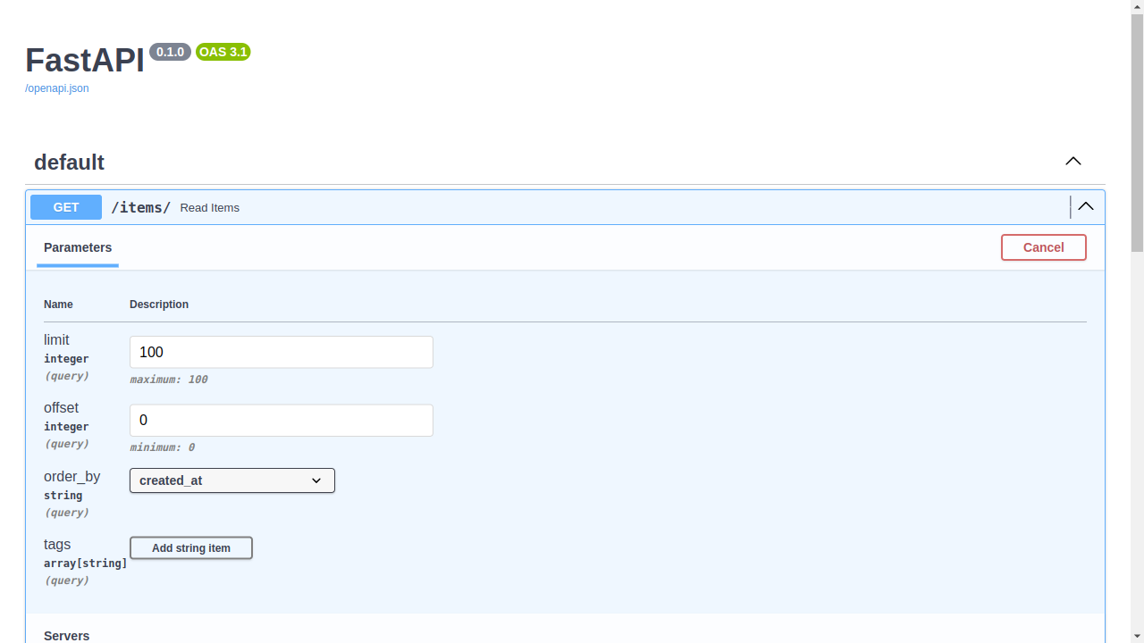 You can see the query parameters in the docs UI at /docs: